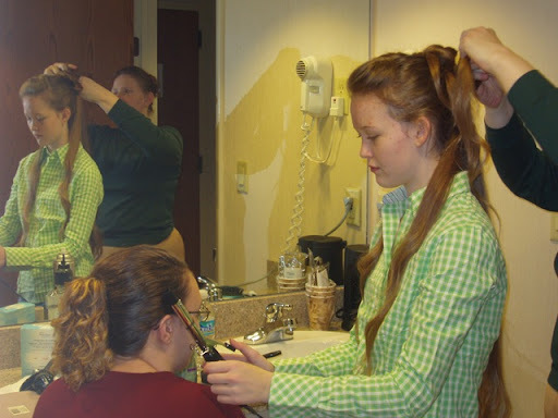 This is what you could call a "hair fixing" production line. I thought it was cute. It was an effort to save time and trying to get everyone ready at the same time. LOL It worked!